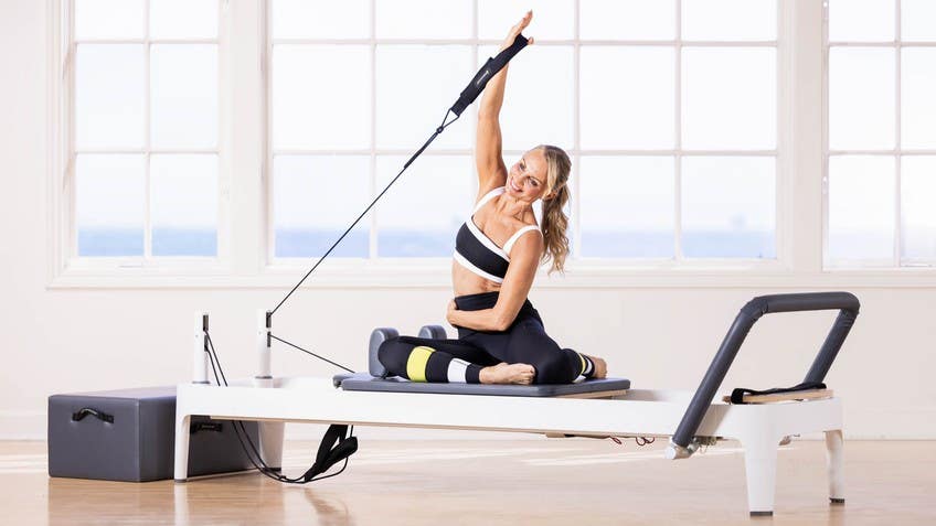 So you're supinating the arm. Sit up nice and tall. Put your hands down onto the reformers to give you a little bit stability, equal weight on your sit bones. Now from here, we're going to go into an extension and then we bring it back and cross over your midsection of your body. Supernate, reach back and up. Now if this is too challenging, which it is, then you can either go to a lighter spring or Don't do the full extension here, and just keep it in a supination. Reach, can we do one more for good luck, underarm grip, supinate reach, and then just let it carry through, through, through, through. And release.
