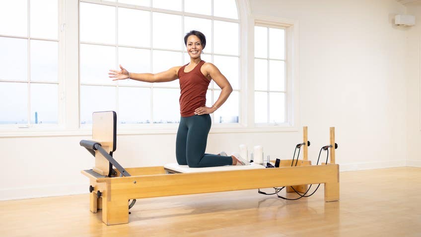 Hi. I'm Misty Lynn Cotton, and we are going to jump today in this workout with a few other things interspersed in between. But what I wanna say before we get started is that the springs that I may select for my body may not work for yours. So please consider what makes you feel supported, what makes you feel comfortable, and not just mirroring what I do. Let's get started. So we'll begin with simple footwork, and I'll mention that you'll need a ball for part of this workout, and, of course, the box. So headrest will go wherever's comfortable for you, and you'll lay back And you're going to press back as far as you need to go to be able to get your heels down in preparation for jumping.