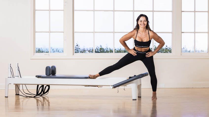 So you could use a ball or just a cushion, kind of fold it up, and you can place it between your calf and the frame, to give you that tactile reminder of where that knee is meant to track. The back leg is gonna fully straighten, and this is a common correction that I give to my clients. When they get here, I want them to pull up through the front of that back leg, pulling the kneecap up, pushing through the heel and finding that straight leg. Let's add some upper body. So as I go down into my lunge, I reach forward, and then rise up.