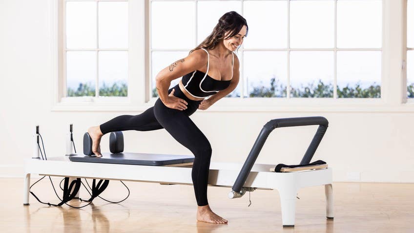 My leg that doesn't have the loop comes back behind, so I'm now in a lunge position. Lower the shape of the body down. As I rise, what I'm trying to feel is my kneecap draw up The leg fully straightened, and I want that carriage to move. The rope is assisting on that flexion, and it's making me harder to straighten, making it harder to straighten that leg. It's making me work harder.