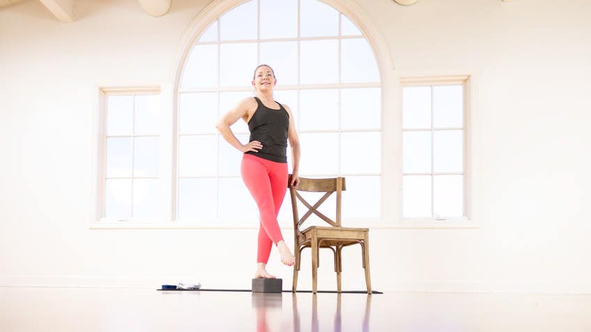It's just no point. Okay. We're coming up to standing for a few things. You can move your props. So I love this. We're gonna work with our chair and our yoga block.