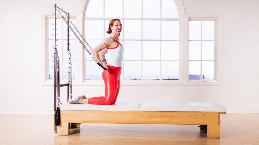 And then, ideally, you set your hands up over your shoulders, but if that's too difficult for you, you can go closer to the springs. And if you want it to be harder, you go further away. I like to do with my knees bent. Because this has already got a lot going on, when you push your feet into the mat and pull them back towards you, we don't have the legs pulling on the back. Right? Now press your pinky side of your hand in the handle. Let's go up and down.