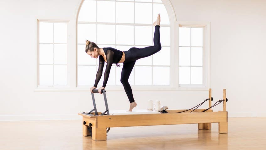 And just starting to move. It's fun to throw this dancer style movement in on the reformer, challenge our practice, challenge our muscles, Go at your own pace. You're here for ten more seconds. Five more seconds. On the next one, keep that left knee into your nose.