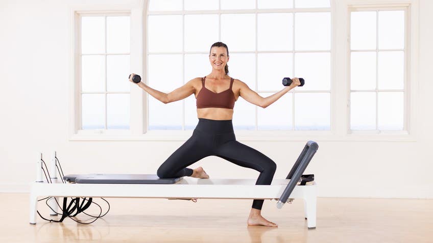 My left hand has the free weight. We're gonna bring our arms forward so we can walk our knees back. Even if you have your shoulder blocks on your knees are right in between those shoulder blocks, we're gonna do a big step with our right leg. So careful as you do so, make sure your foot is really far forward, so you're not so close to your standing knee. We're gonna kneel up very tall. I want you to plant that right foot into the carriage. Palms are up. We're gonna go into a serving arm here.