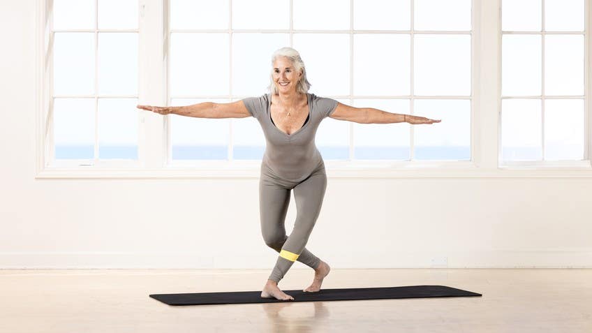 Hello. I'm Madeline Black, and we're going to do a mat class focusing on shoulders and hips. And you will need a resistance band about this long. And it can be different colors, different resistance. This is yellow, which is a light band. And when you wanna increase the resistance, you make a heavier band, or you can just make your grip a little shorter, makes it tighter.