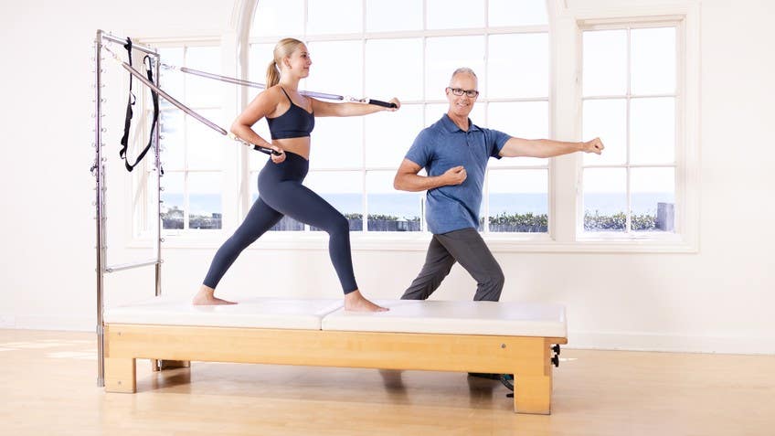 Hi, everybody. I'm Tom McCook. Great pleasure to be back with Pilates anytime, and I'm here with Katie, who'll be my model today. And this is a tower class, full body, flexibility, and strength. With some work we're gonna do in the beginning to lubricate the spine and get better mobility with the support of the springs. So I have a setup for you that I like you to understand before we start.