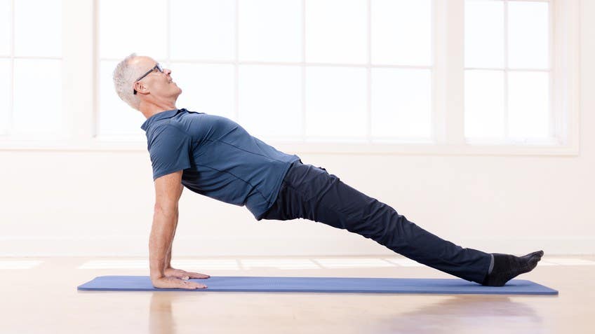 Have your hands a little behind you. If you need to, you can turn your palms out if that feels uncomfortable on your wrist. Or even to the back. I don't like it this way myself, but do what works for your body. Pull your shoulders back, point your feet, reach into your legs and press up as you create a line through your body.