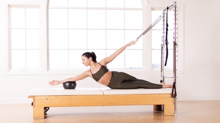 Hi. I am Lara Hanlin here to lead you through a class on a tower using a small ball. We'll get started facing our tower side with our feet about hip distance apart. This nice squishy ball will be placed in between the inner thighs. And we'll begin with our brown bar here, our rollback bar. I'll be using this bar today using the push through bar with a spring at the top and at the bottom as well as my leg springs.