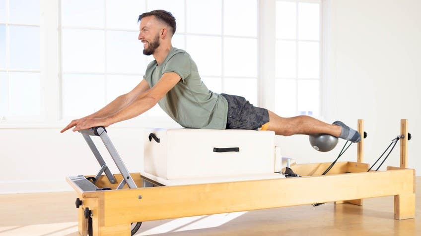 For today's total body reformer workout, make sure you have the ball and also make sure it has a little bit of give because that feedback is gonna be very valuable for this workout today. Let's begin with some footwork. Shall we? I'm gonna take off a spring so I've got four springs loaded up, and I'm gonna put the ball between my inner thighs as I get nice and comfortable on the reformer. Let's begin on the toes. Lay on your back.