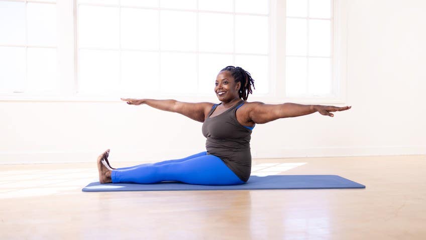 And I want you to know if you don't have a lot of hamstring mobility, it's okay to bend the knees so you'll have that position so you can sit up straight. So remember that Also, we'll be having our arms out. So if your arms are like, oh, this is too much, you can go ahead and cross your chest here. So we're gonna start by flexing at the ankle spine, that tall tall spine, arms shoot out to the side palms down keeping the crown of the head reaching towards the ceiling. Both hips stay pinned to the mat. As we inhale here, we twist at the waist like keeping both sides of the hips connected to the mat.