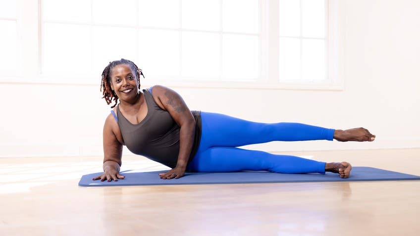 This exercise is the side kick. Now there's some archival moments in here, but I also wanna show you some things that'll make it better for your practice and your body. So what we're gonna start with is we're gonna layer bodies down to the side And also note that when we work in the side of the body, the lateral side of the body, that we are working all sides of the body. So this is so very important. We don't skip this one.