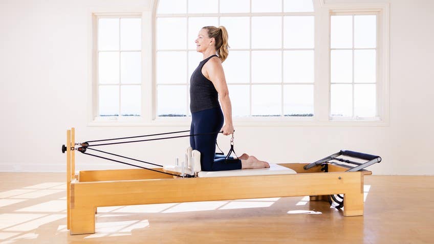 I would safely place your hands on the shoulder blocks to get set up. We walk our knees right up to the shoulder rests. And before we reach down and pick up the straps, Let's check into our alignment what we're our goal to maintain. Once again, shoulders over pelvis, this plumb line without hips behind us, without rib cage forward. We're in that nice head over shoulders over pelvis over the knees. We're maintaining that position, but this exercise adds an element of balance challenge front to back as the carriage moves.