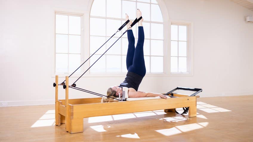 They're right up to the ceiling. We're trying to control the amount of hip flexion. Not increasing it like we saw in one of the versions of short spine. Taking a breath. So it starts with that deep lumbar reflection. We try to hold the carriage absolutely still.