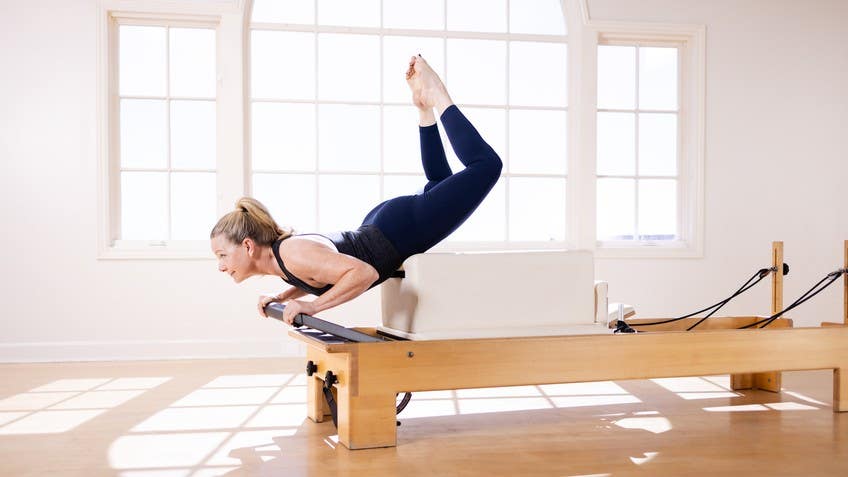 You reach your chest forward, rock your legs up. Bend the knees, now watch the ankles go cross, cross, they go up and open and the legs together one, two, three, one more time, bend the elbows, lift those legs, bend ankles, ankles, legs go up and open and beat, beat, beat, come down, and that is your grasshopper on the reformer.