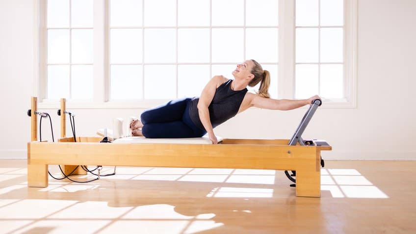 Are you breathing in? Exhale as you come closer to the stopper, you're pulling up, you're twisting, and your side bending, you're really ringing it out. And that is cleopatra on the reformer.