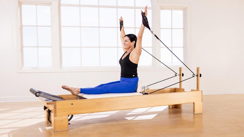 Now here, I'll come up shoulder height. And as I go beyond shoulder height, be aware of not having your hands too narrow and perhaps internally rotating a little bit the hands in order to make sure you can make this straight up and down shape with the arms. This will make sure that the straps don't get stuck on your body. From here, keeping the carriage still, we take the arms down and around and we might touch the edge of the reformer and then bring the arms back to the starting position. So here, pressing the arms to straight, we go down, and then there's this energy up all the way up in alignment with the body here. Maybe it feels a little like you're behind your body, circle around trying to keep the carriage still and back to starting position.