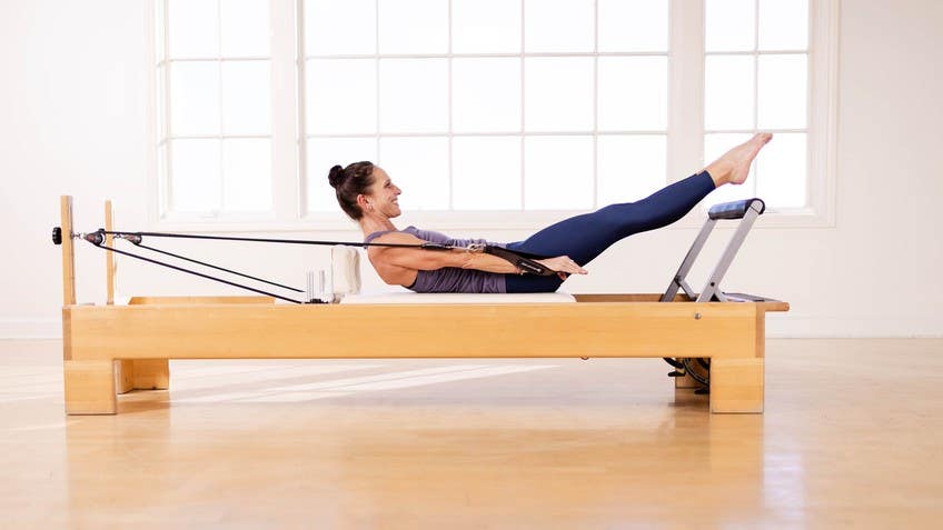 We then inhale. And we begin our count exhaling for five. And inhaling for five. And as we continue to inhale and exhale for five, you want the feeling of reaching forward with the arms to achieve two goals. Number one, to stabilize the shoulders and number two, to try to hold the carriage fairly still.