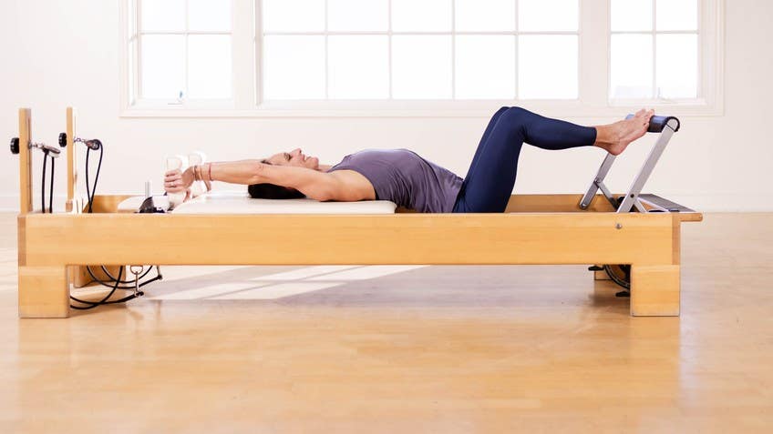 Bending the knees in and holding the carriage still as the pelvis comes back up. To exit the exercise, you can just go the way you came in. Use drape your knees over the footbar and then we can just pull the carriage in wiggle in and we're back down on the carriage. In relationship to the spring, the light spring is a little bit more challenging for the lakes because it's less stable. For the heavier spring, makes it much more challenging to keep the arms really active and straight.