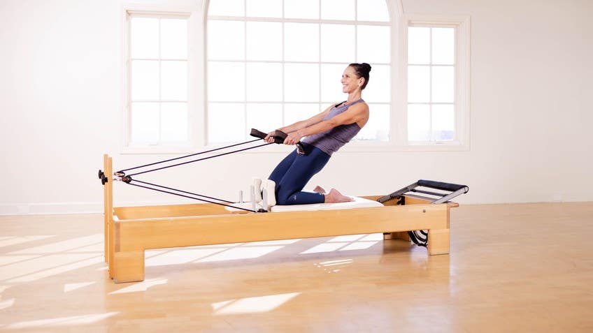 Let's look at thigh stretch on the reformer. The funny thing about Pilates is when you hear the word stretch, you think stretch. And there is a stretch in the thighs, but it's very intense. And this exercise is a advanced exercise. This is actually a lot of work.