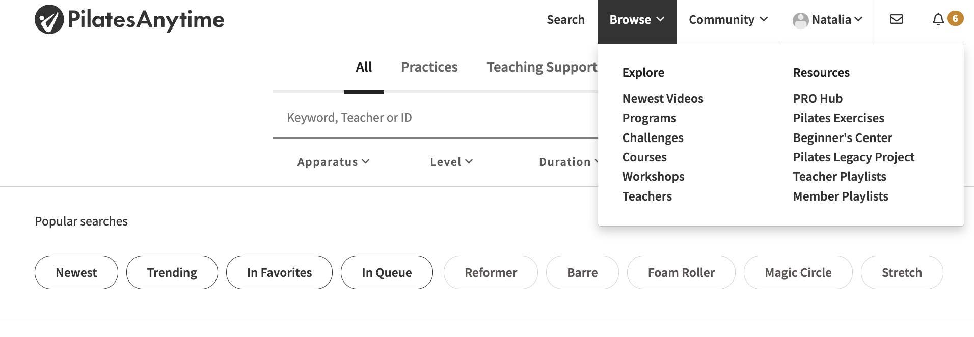 1) https://www.pilatesanytime.com/search - This space is the Search Hub which will allow you to look for classes based on equipment, level, duration, props used, and more!