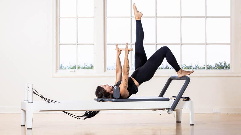 Hold the next one up. Pulse five four three two one and roll it down. Let's get off of the reformer with the reformer roll up, take a big breath in. Exhale all the way up you go. That was so much fun. Okay.