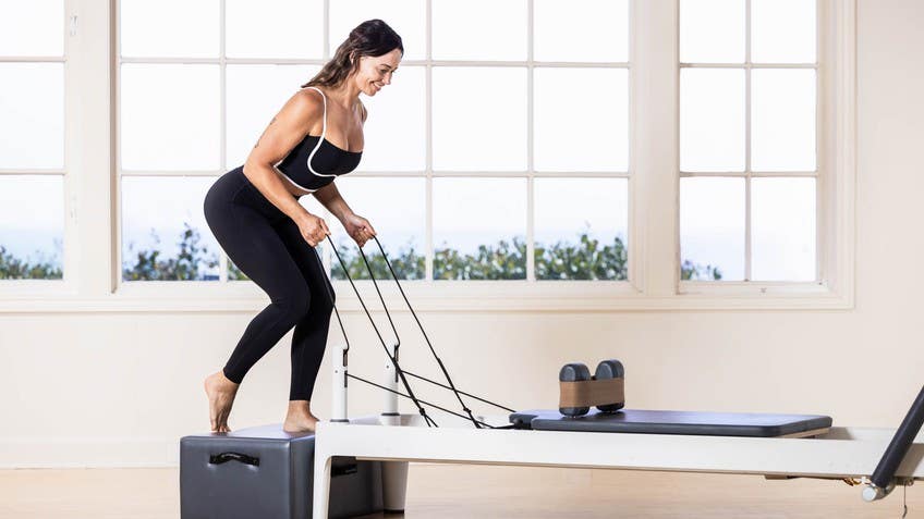 So I'm not just jumping vertically. I'm getting that lateral movement as well. Five, four, three, two, And one, we did it. Great. Alrighty. Come back over to your reformer. Grab one loop, the one that's closest to you. You're gonna step the leg that's closest to the machine through.