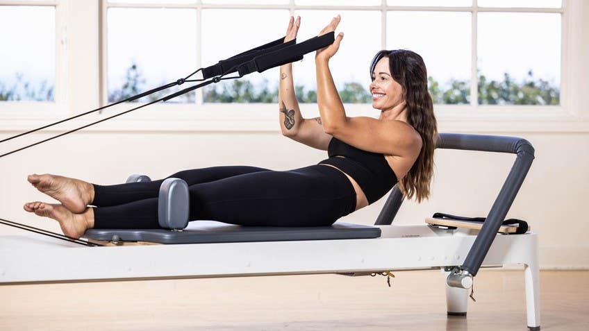 Forward push. Five four three Two, the secret is to push really far forward, and then drop the elbows. One, and bring it in into a heavy upper body seated series. So legs can come through the shoulder blocks, I'm gonna choose the short loops for this. If the red feels on the heavy side, use your long loops.