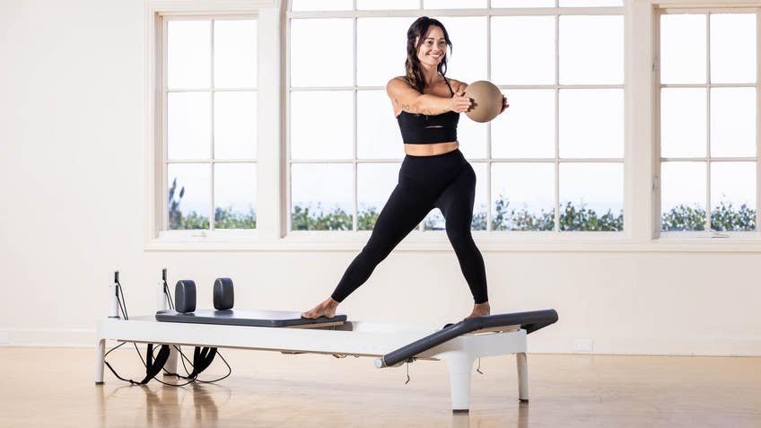 Grab that ball, come off to one side. We have to make a couple changes. So we're gonna drop our foot bar down two notches so the platform is available. And adjust the springs. So we're gonna do a skater series, which is a glute focus.